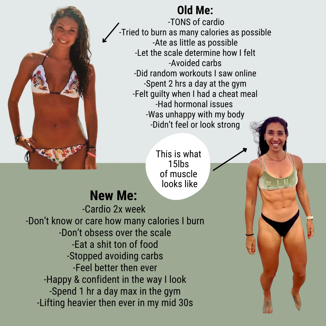 I know my method works because I’ve lived through the trial and error myself. It took me 12 years of trying all the wrong things: too much cardio, restrictive dieting, avoiding carbs, fasting, and jumping from boot camps to HIIT workouts.